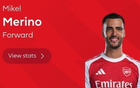 传射建功,梅里诺当选阿森纳vs小蜜蜂全场最佳球员